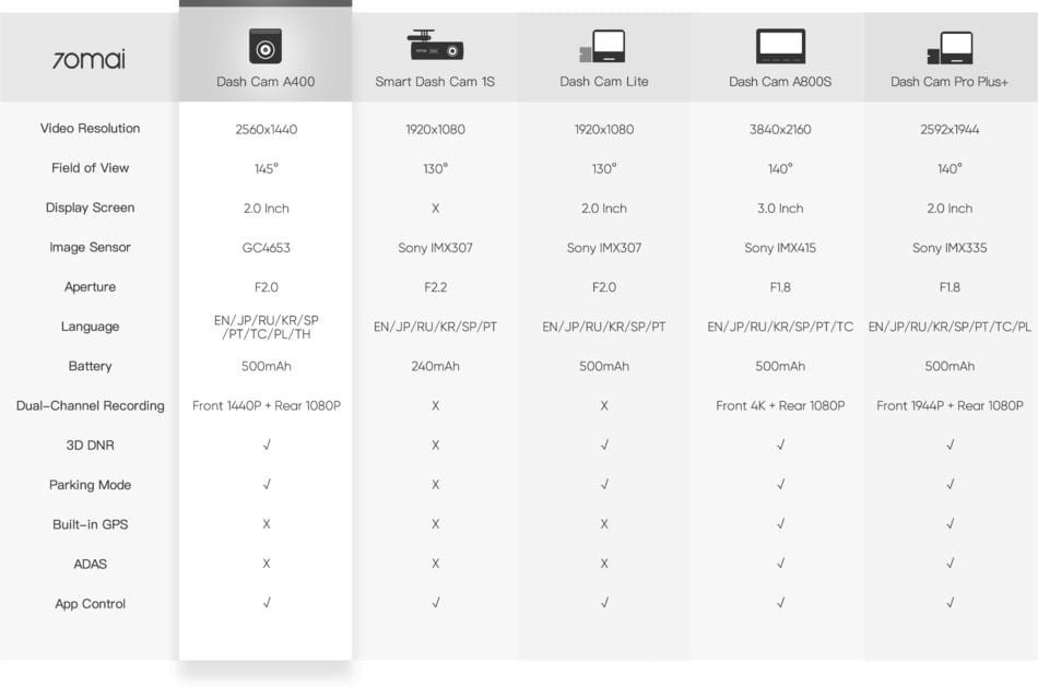 70mai A400 má zabudovaný 3,6-megapixelový snímač so svetelnosťou F/2.0. Tieto vlastnosti zaručujú ostré snímky za všetkých svetelných podmienok. Fotoaparát A400 umožňuje dvojkanálové nahrávanie, čím poskytuje všestranné pokrytie na zvýšenie bezpečnosti (dvojkanálové nahrávanie je povolené pomocou zadného fotoaparátu, ktorý nie je súčasťou dodávky). Kamera A400 zaznamenáva v rozlíšení QHD 2560 × 1440, ktoré poskytuje vynikajúcu čistotu a presnosť farieb. Široký 145° uhol záberu pokrýva minimálne tri jazdné pruhy, čím sa v každej snímke zachytí ešte viac udalostí.Vylepšené nočné videnie
