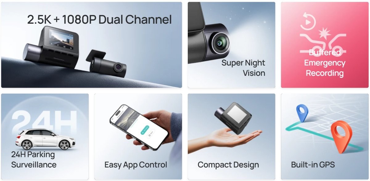 Autokamera 70mai A410 je spoľahlivý svedok na každej ceste. Predná kamera nahráva v ostrom rozlíšení 2.5K a s voliteľnou zadnou kamerou RC21 získaš aj záznam v kvalite 1080P, takže zachytíš každý detail spredu aj zozadu. Vďaka svetelnej clone F1.55 a technológii HDR sú zábery čisté a jasné aj v noci alebo pri zlom počasí. Inteligentný parkovací režim s G-senzorom stráži auto nepretržite a automaticky zaznamená každý náraz alebo podozrivý pohyb. Vstavaná GPS ukladá trasu aj rýchlosť jazdy a všetky funkcie jednoducho ovládaš cez intuitívnu aplikáciu 70mai v mobile. Ak k A410 pripojíš zadnú kameru RC21, získaš dvojkanálový záznam v kvalite 2.5K + 1080P. Zadná kamera je dostupná samostatne alebo v sete s A410.