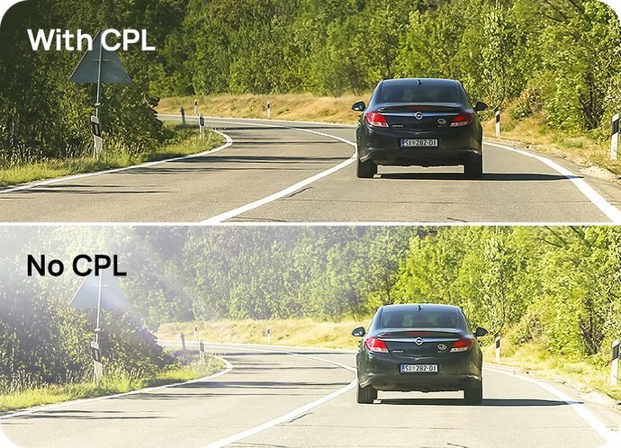 CPL filter je polarizačné príslušenstvo, ktoré umožňuje najpohodlnejšiu expozíciu pri záberoch z palubnej kamery. Znižuje povrchové odrazy na čelnom skle alebo intenzívne slnečné oslnenie pred autom. Môžete tak získať tie najlepšie zábery počas jazdy bez ohľadu na zložité svetelné podmienky.Živšie zábery