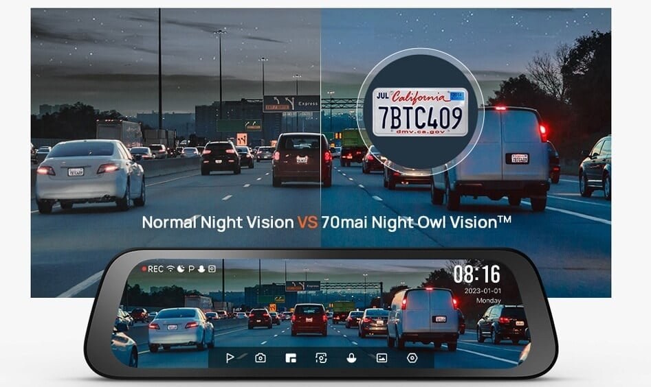Pri nahrávaní v noci alebo v náročných svetelných podmienkach oceníte technológiu 70Mai Night Owl Vision, ktorá poskytuje čistý, živý obraz s minimálnym šumom. Vďaka clone f/1,8 a duálnemu záznamu HDR sú všetky detaily na zázname dokonale viditeľné, či už jazdíte cez deň, alebo v noci.Duálny záznam HDR a širokouhlý záber