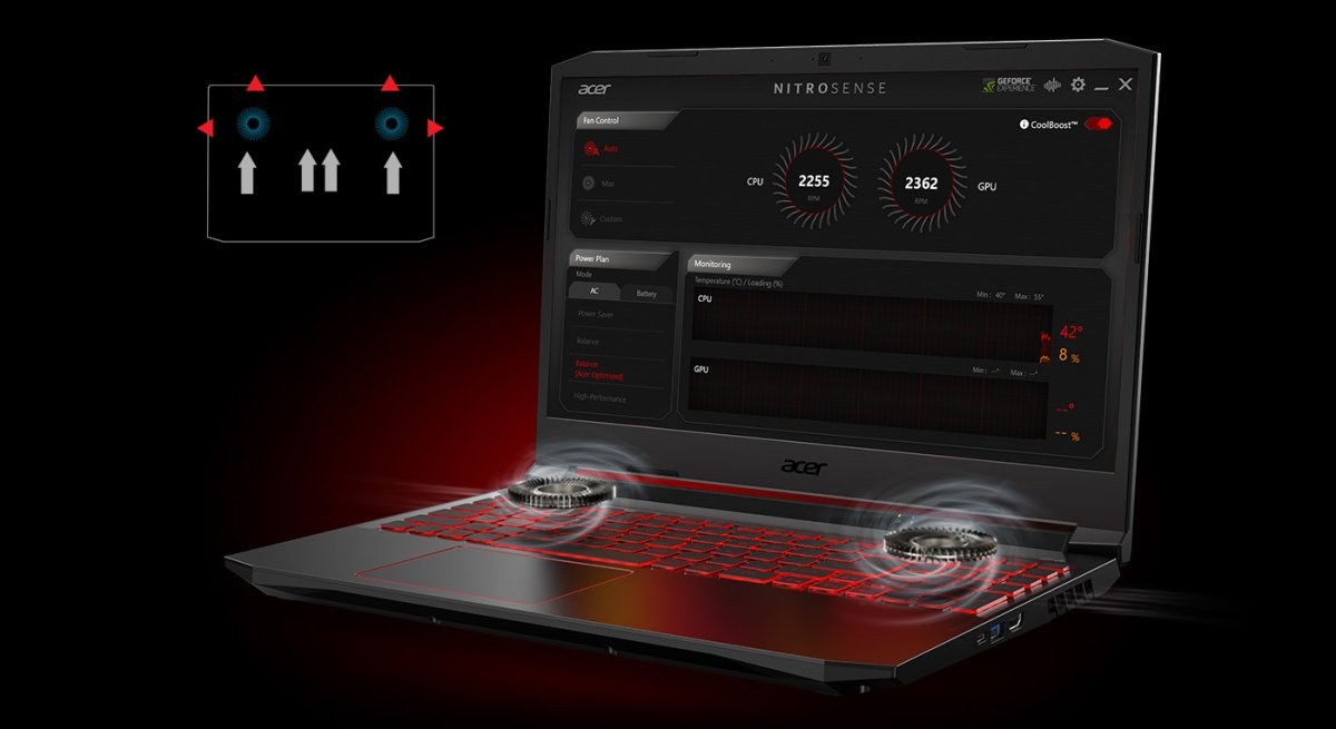Acer Nitro 5 je vybavený technológiou Acer CoolBoost, tá umožňuje dvom ventilátorom a štvorici vetracích otvorov zvládnuť chladenie aj pri náročnom používaní. Technológia CoolBoost™ zvyšuje v porovnaní s automatickým režimom rýchlosť ventilátora o 10% a chladenie procesora a grafickej karty o 9%. Sledujte a spravujte svoj systém v reálnom čase pomocou softvéru NitroSense, v ktorom je možné kontrolovať teploty, rýchlosti ventilátorov a mnoho ďalšieho.
