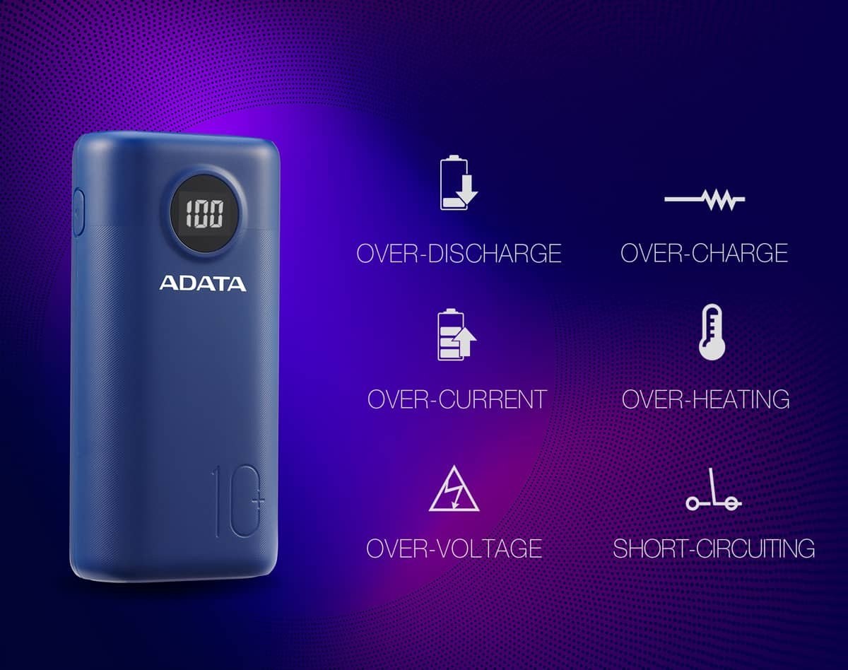 P10000QCD je vybavená digitálnym displejom, ktorý zobrazuje presný stav powerbanky. Môžete nabíjať jedno alebo tri zariadenia súčasne a stále budete mať presný prehľad o zostávajúcej energii.Viacnásobná ochrana obvodov