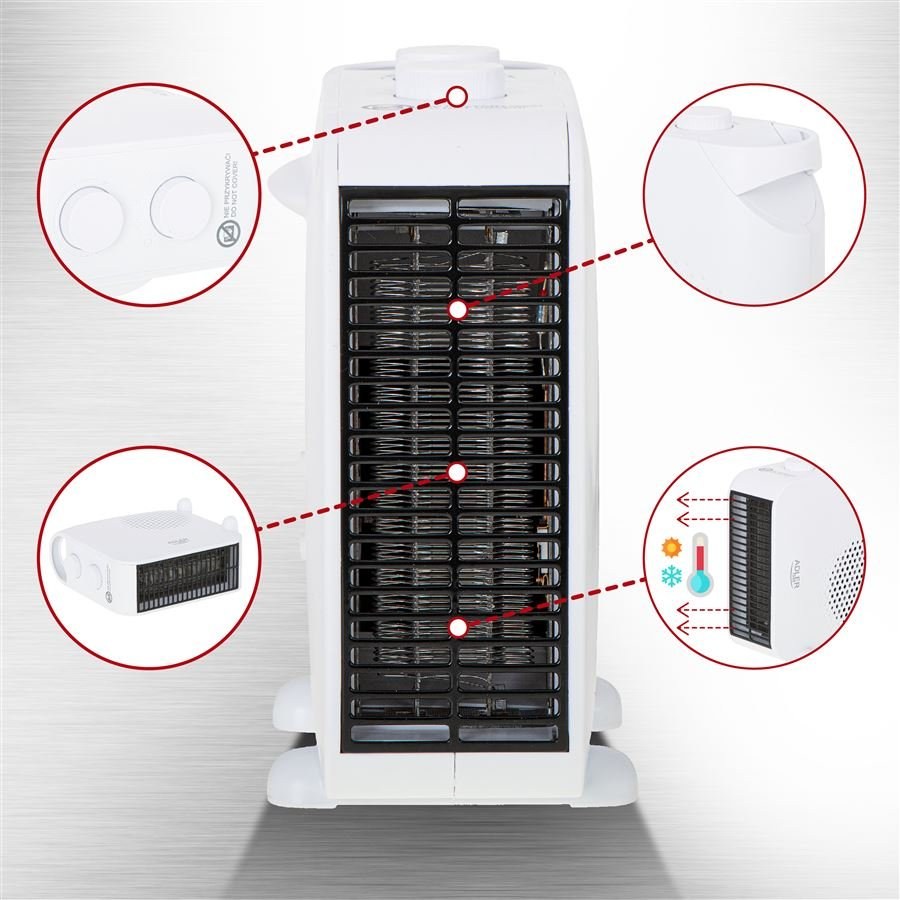 Teplovzdušný ventilátor Adler AD7725 pracuje pri dvoch vykurovacích výkonoch a teplota je termostaticky riadená. Vďaka tomu je možné množstvo horúceho vzduchu emitovaného ohrievačom prispôsobiť potrebám jeho užívateľa. AD7725 možno použiť aj ako ventilátor na ochladzovanie vzduchu. Vďaka týmto funkciám je teplovzdušný ventilátor užitočný v horúcich aj chladných dňoch. Z bezpečnostných dôvodov je zariadenie vybavené ochranou proti prehriatiu. Ďalšou výhodou je skutočnosť, že AD7725 môžete používať vo vodorovnej aj zvislej polohe.
