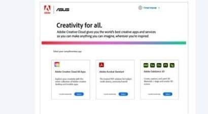 Spoločnosti ASUS a Adobe spolupracujú na rozvíjaní vašich tvorivých schopností vďaka predplatnému služieb Adobe® Creative Cloud®, Adobe Acrobat Standard DC a Adobe Substance 3D zadarmo.