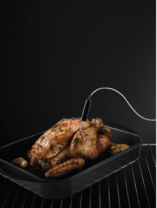 Teplotná sonda, ktorá je súčasťou tejto rúry, umožňuje v priebehu pečenia merať teplotu v strede pokrmu. Zakaždým tak bez námahy dosiahnete dokonalé výsledky.