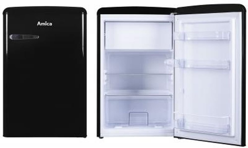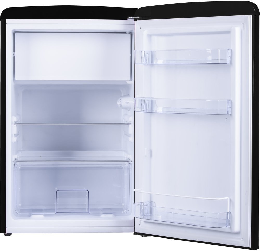 Jednodverová chladnička s mrazničkou; Farba Čierna; Energetická trieda: E; Celkový čistý objem: 108 litrov; Čistý objem chladenia: 93 litrov; Čistý objem mrazenia: 13 litrov; Spotreba energie podľa reg.EU: 0,36 kWh / 24h; Mraziaci výkon: 2 kg / 24h; Akumulačná doba: 11 hodín; Hlučnosť: 37 dB; Mechanické ovládanie termostatu; Automatické odmrazovanie chladiacej časti; Trieda mraziaceho priestoru: 4 *; Poličky v chladničke: 2; Zásuvky na zeleninu: 1; Priehradky vo dverách chladničky: 3; Safety glass; Ročná spotreba energie: 133 kWh; Klimatická trieda: ST;Technické parametre: