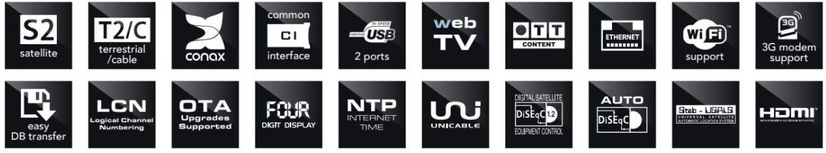 satelitný prijímač, 4K Ultra HD (3840x2160), DVB-S2 1x, DVB-T2 (H.265/HEVC), HDMI, SCART pomocou A/V redukcie, LAN RJ45 100 Mbit, USB 2.0, po doplnení WiFi USB, CI/CI+ SlotZobraziť viac