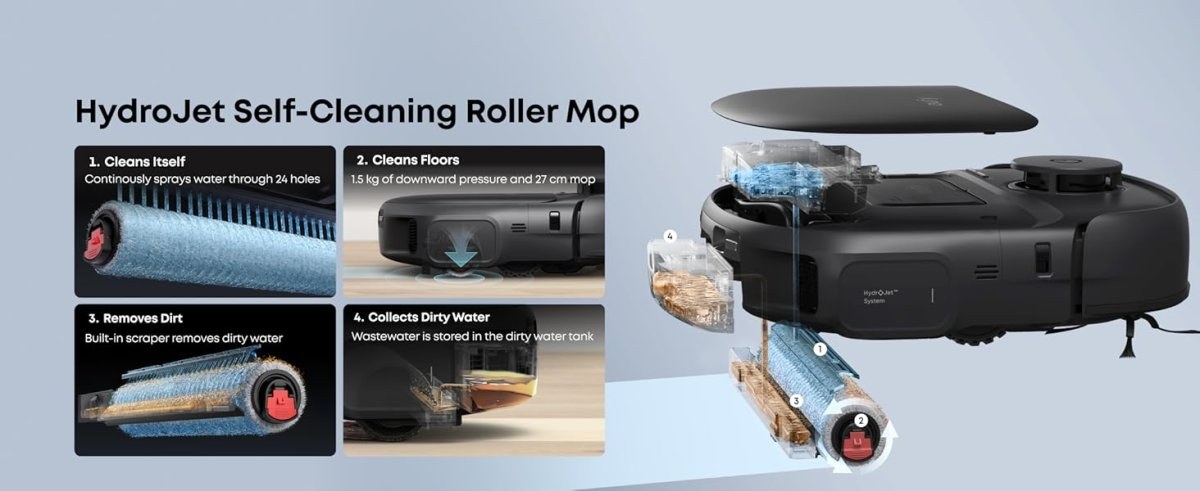 Sací výkon až 15 000 Pa pre dôkladné odstránenie prachu, vlasov aj zvieracích chlpov.Mopovací systém HydroJet s rotačným valcovým mopom, ktorý aktívne čistí podlahu a počas upratovania sa priebežne preplachuje.