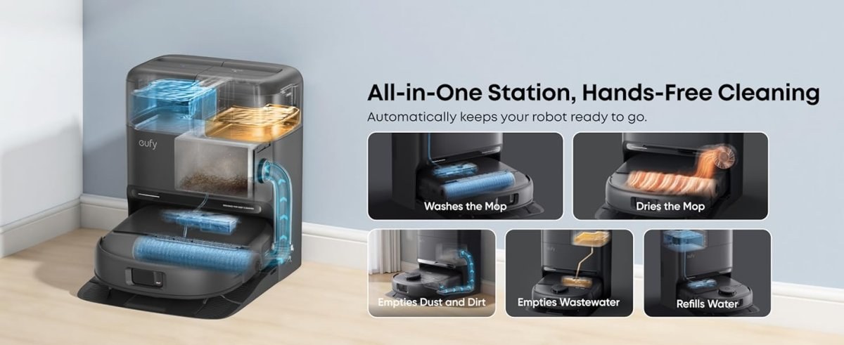 All-in-One stanica – automaticky vysype prach, doplní a vylieva vodu, vyčistí mop a vysuší ho teplým vzduchom.