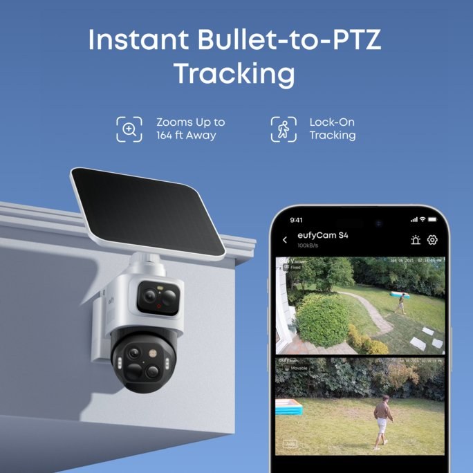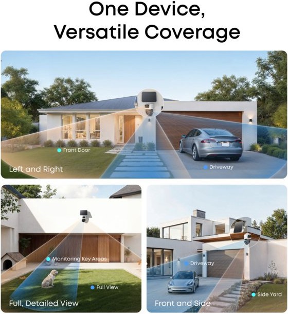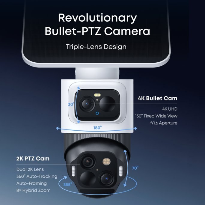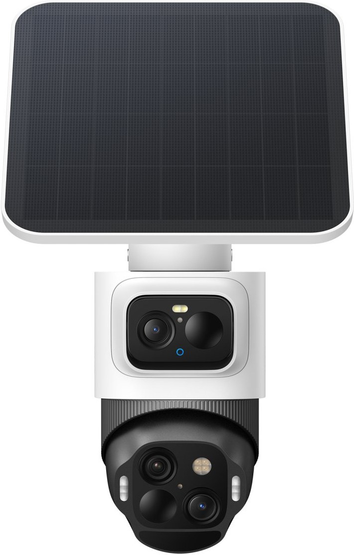 horná širokouhlá kamera s rozlíšením 4K poskytuje pevný 130° pohľad na celú oblasť, zatiaľ čo spodná kamera s rozlíšením 2K a dvojitým objektívom Pan-Tilt-Zoom sa otáča o 360° a poskytuje tak komplexné pokrytie.
