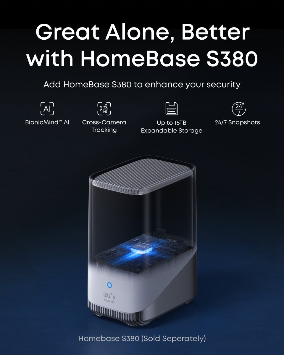 Lepšie s HomeBase S380: Odomknite BionicMind™ AI a okamžite rozlíšte členov rodiny od cudzích osôb. Vďaka 16 GB vstavanej pamäte, ktorú možno rozšíriť až na 16 TB, môžete byť pokojní, že máte istotu, že môžete bezpečne uložiť hodiny záznamov. Pred nastavením aktualizujte HomeBase S380 na verziu V3.7.2.8 alebo novšiu a použite najnovšiu verziu aplikácie eufy; inak eufyCam S4 nebude podporovať nahrávanie 24/7 ani funkciu Snapshot.