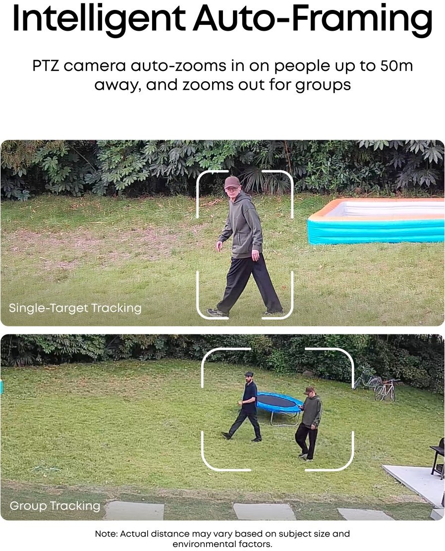 2 v 1 trojitá kamera typu bullet a kamera s funkciou Pan-Tilt-Zoom: Horná širokouhlá kamera s rozlíšením 4K poskytuje pevný 130° pohľad na celú oblasť, zatiaľ čo spodná kamera s dvojitým objektívom a funkciou Pan-Tilt-Zoom s rozlíšením 2K sa otáča o 360° a poskytuje tak komplexné pokrytie.Sledovanie Bullet-to-PTZ a automatické rámovanie: Keď kamera Bullet zistí osobu, kamera Pan-Tilt-Zoom ju zaostrí a automaticky sleduje s ostrým, centrickým priblížením až do vzdialenosti 50 metrov. Keď do záberu vstúpia ďalšie objekty, automaticky sa oddiali, aby boli všetky viditeľné.
