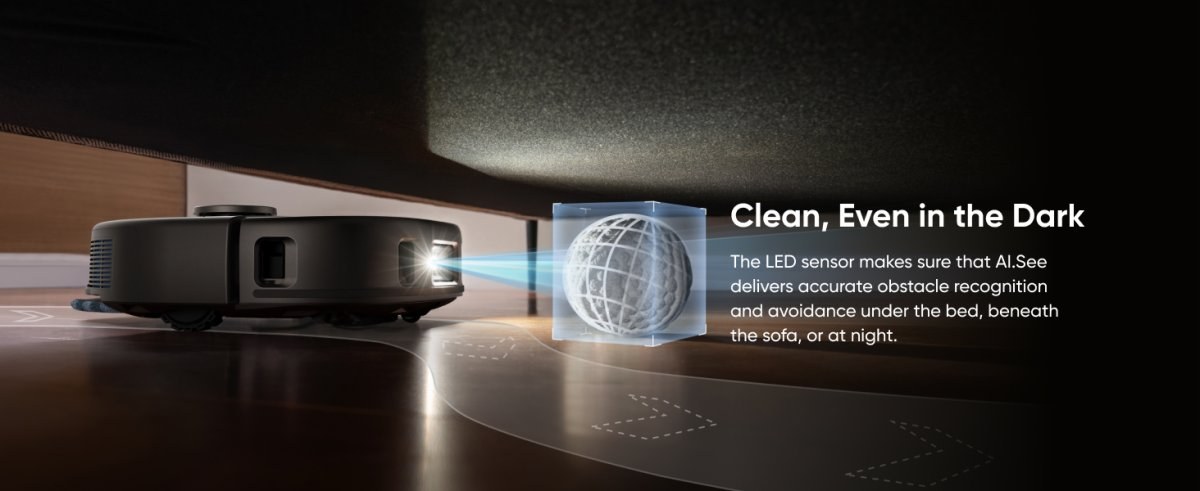 LED senzor zaisťuje, že AI.See poskytuje presné rozpoznávanie a vyhýbanie sa prekážkam pod posteľou, pod pohovkou alebo v noci.