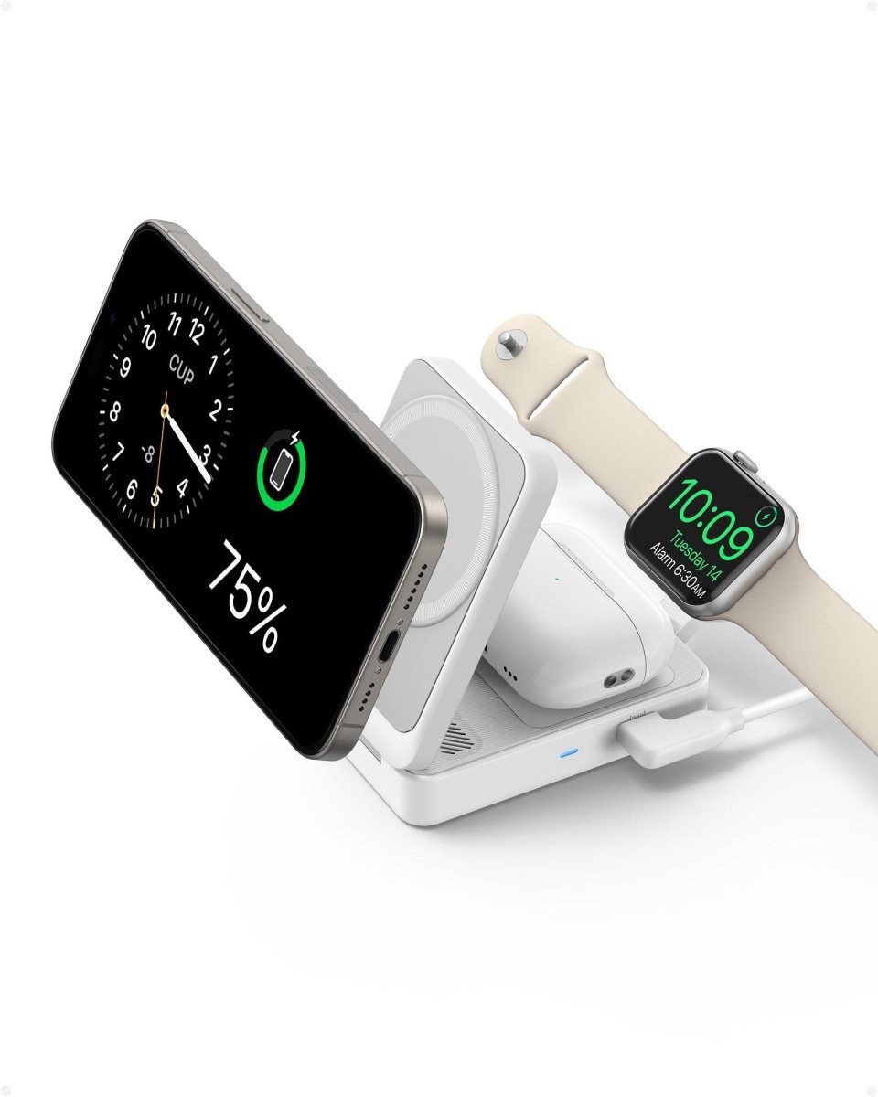 Nabíjačka Apple 3 v 1: Nabíjajte svoj iPhone, AirPods a Apple Watch súčasne a využívajte všestrannosť vstavaného nastaviteľného stojana na telefón.
