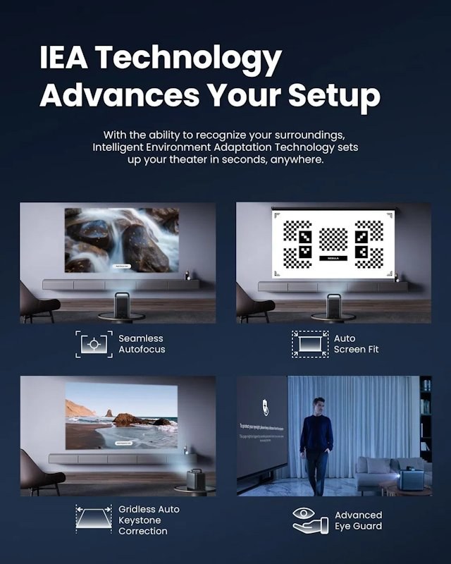Inteligentná konfigurácia IEA 4.0: Cosmos 4K SE sa inteligentne prispôsobí vášmu priestoru pomocou automatického zaostrovania v reálnom čase, korekcie lichobežníkového skreslenia, automatického vyhýbania sa prekážkam, prispôsobenia obrazovky, farby stien, okolitého osvetlenia a ďalších funkcií.