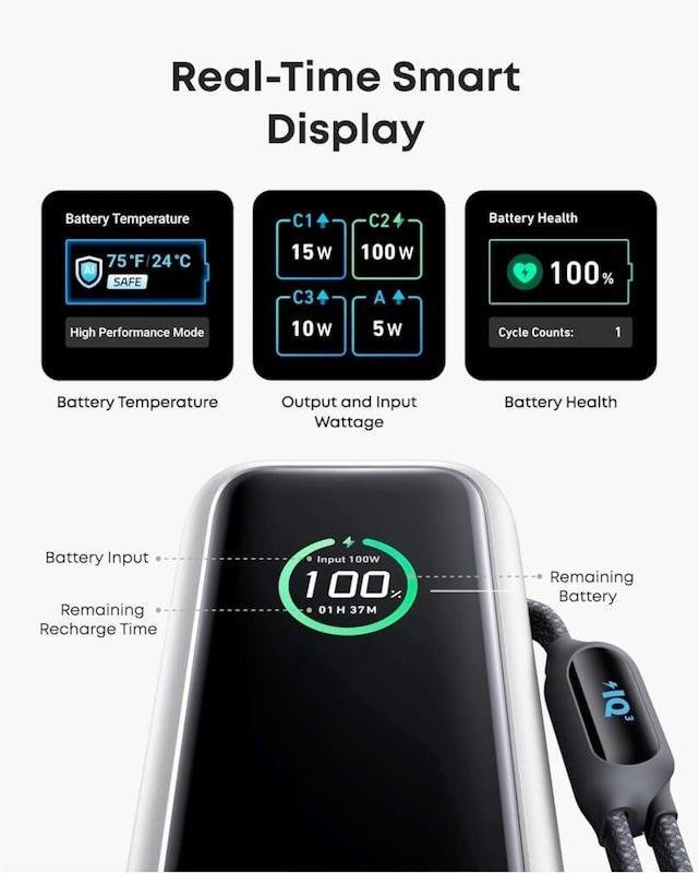 Sledujte zostávajúci stav batérie, výstup, príkon, čas dobíjania a ďalšie informácie vďaka inteligentnému displeju, ktorý ponúka živé aktualizácie.