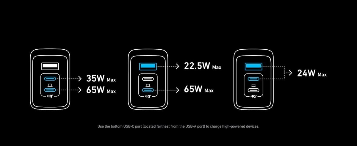 2 porty: USB-C 1 – 65 W + USB-C 2 – 35 W / USB-C 1 – 65 W + USB-A – 22,5 W / USB-C 2 + USB-A – 24 W