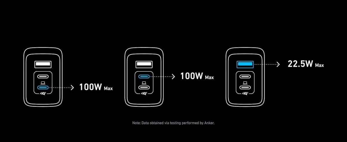 100 W rýchla nabíjačka pre viacero zariadení: Napájajte tri zariadenia súčasne s celkovým výkonom 100 W prostredníctvom dvoch portov USB-C a jedného portu USB-A pre efektívne rozdelenie energie.PowerIQ 3.0 (kompatibilný s PD a PPS)