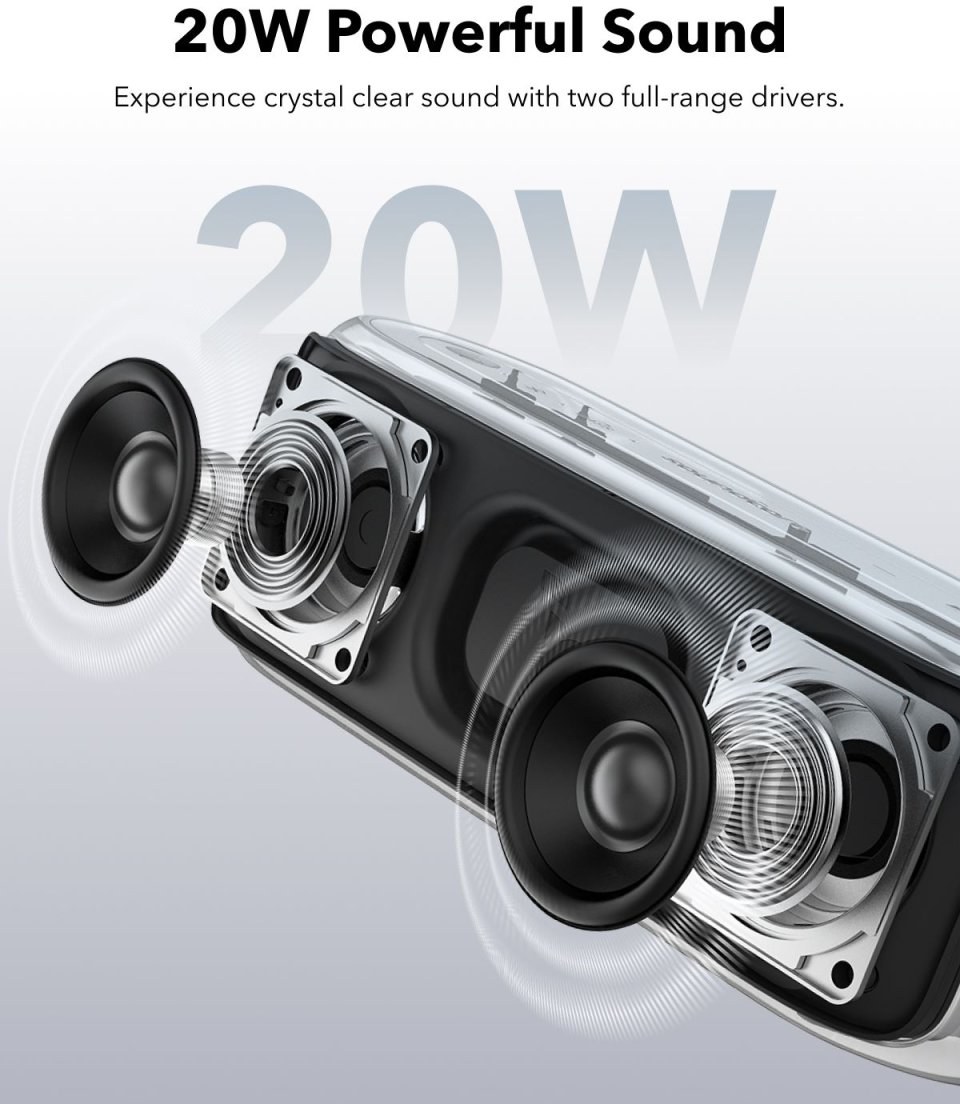 Vychutnajte si bohatý 20W stereo zvuk a čistotu s týmto bezdrôtovým reproduktorom Bluetooth s dvoma širokopásmovými meničmi.