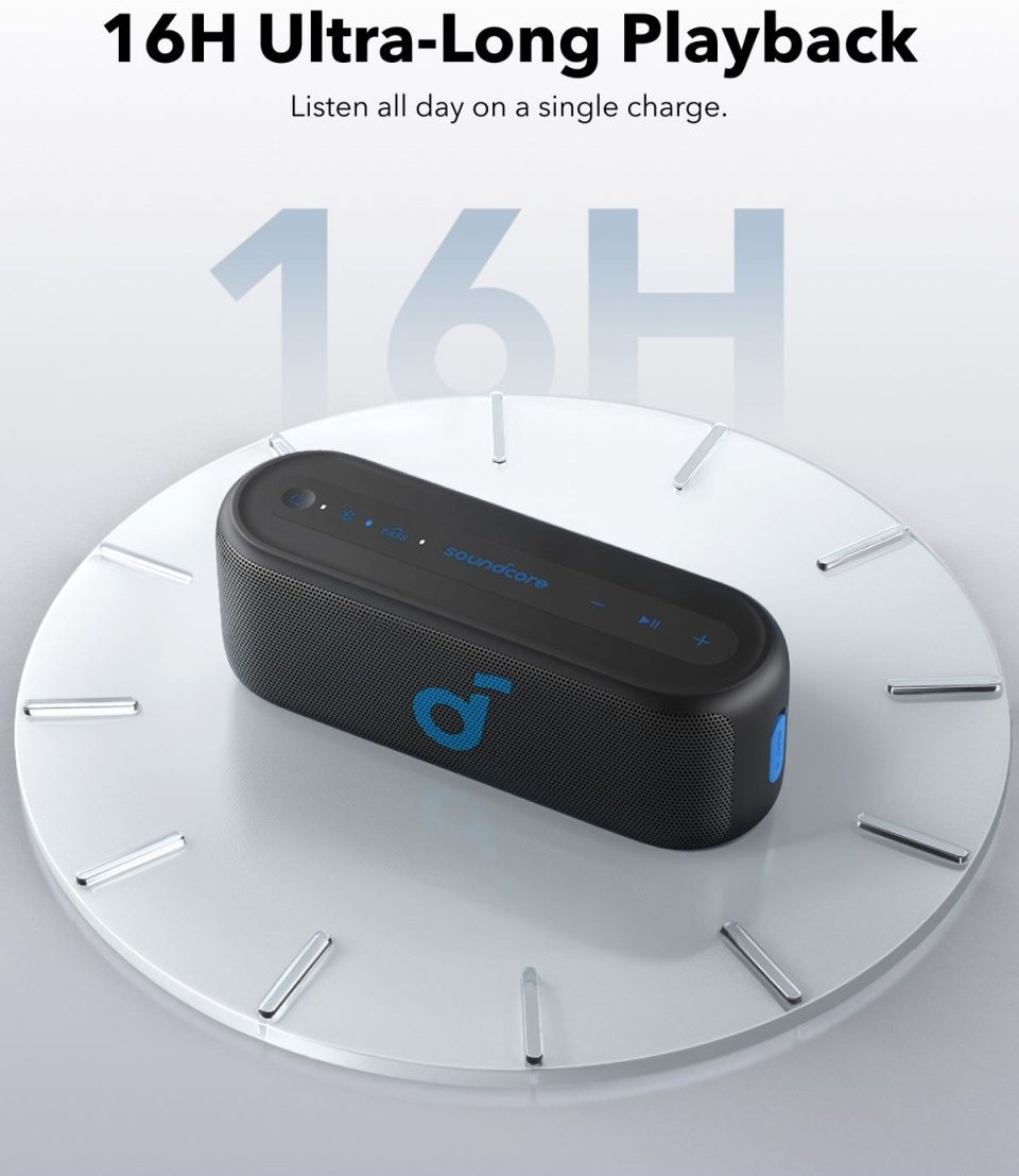 Vychutnajte si svoju obľúbenú hudbu po celý deň – od rána do večera – vďaka batérii, ktorá poskytuje až 16 hodín nepretržitého prehrávania. Je ideálny na dlhé túry, párty alebo relaxačné dni na pláži. Nemusíte sa starať o časté nabíjanie – reproduktor poskytuje nepretržitú zábavu, takže sa môžete sústrediť na zábavu a vychutnávanie si výnimočných okamihov.