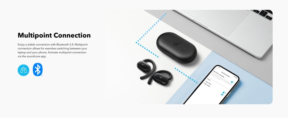 Vďaka technológii Bluetooth 5.4 si môžete vychutnať stabilné pripojenie a plynulo prepínať medzi notebookom a telefónom. Pomocou aplikácie Soundcore môžete rýchlo a jednoducho spravovať svoje hovory a zostať neustále v spojení.