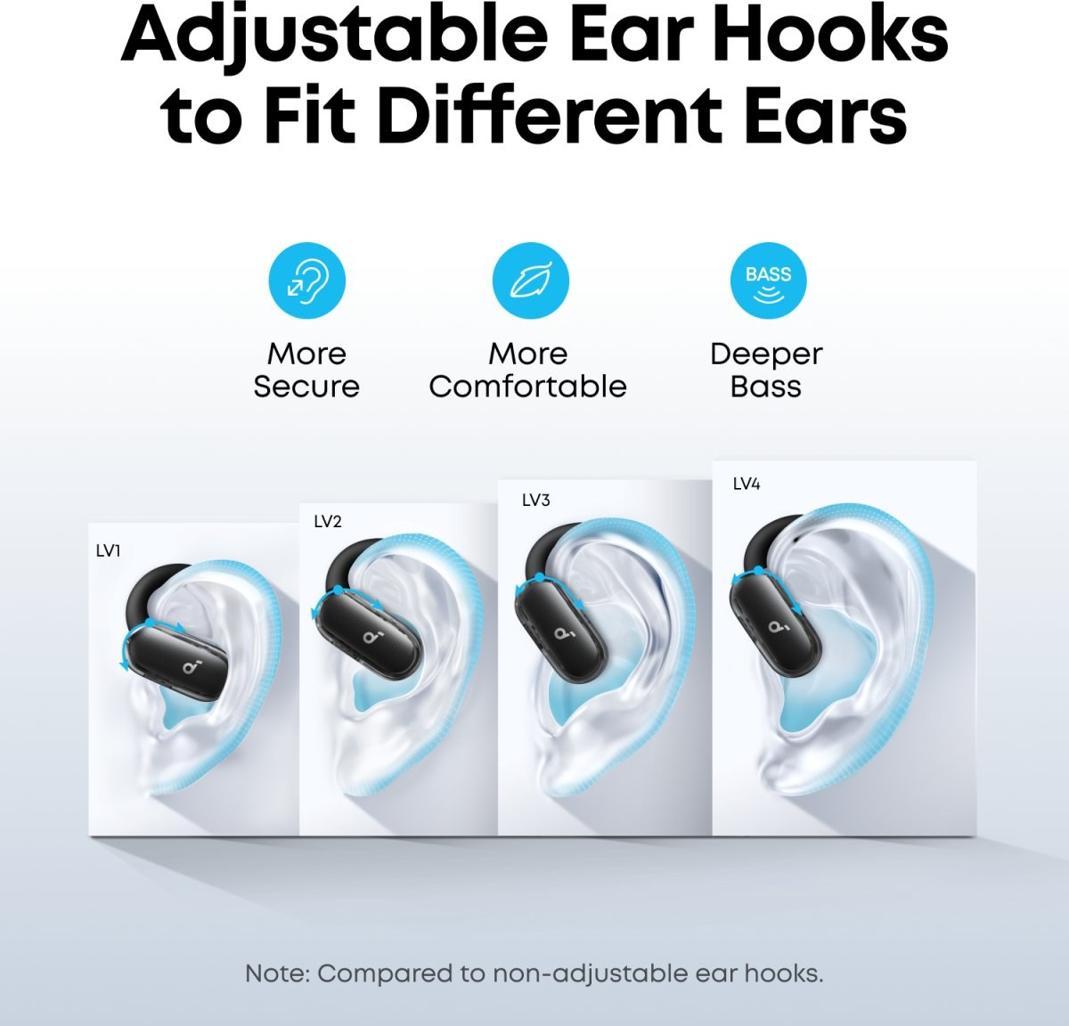 Perfektne padnú do každého ucha: Inovatívne štvorstupňové nastaviteľné ušné háčiky Soundcore zabezpečujú pohodlné nosenie pre viac ako 99 % tvarov a veľkostí uší.