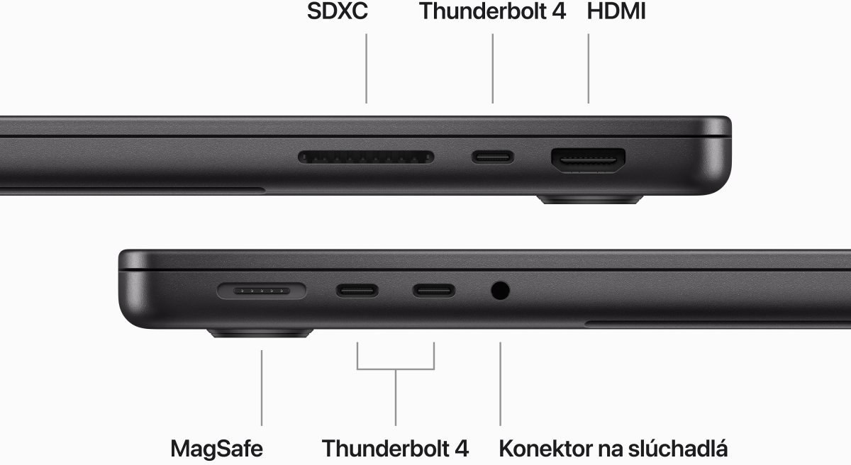 Apple MacBook Pro 14 sa môže pochváliť aj nádherným displejom s uhlopriečkou 14.2", ktorý ponúka rozlíšenie 3024x1964 pixelov a jas 1000 nitov. Displej je typu Liquid Retina XDR a podporuje technológie ako ProMotion, True Tone, P3 a HDR. Vďaka tomu si budete môcť užiť ostrý, plynulý a farebný obraz, ktorý sa prispôsobí vašim potrebám a okolitému svetlu. Displej má tiež tenké okraje, vďaka čomu je celková veľkosť notebooku kompaktná a elegantná.