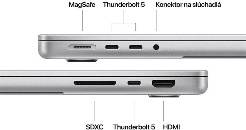 3× Thunderbolt 5 (nabíjanie, DisplayPort, Thunderbolt 5: až 120 Gb/s, Thunderbolt 4: až 40 Gb/s, USB 4: až 40 Gb/s)