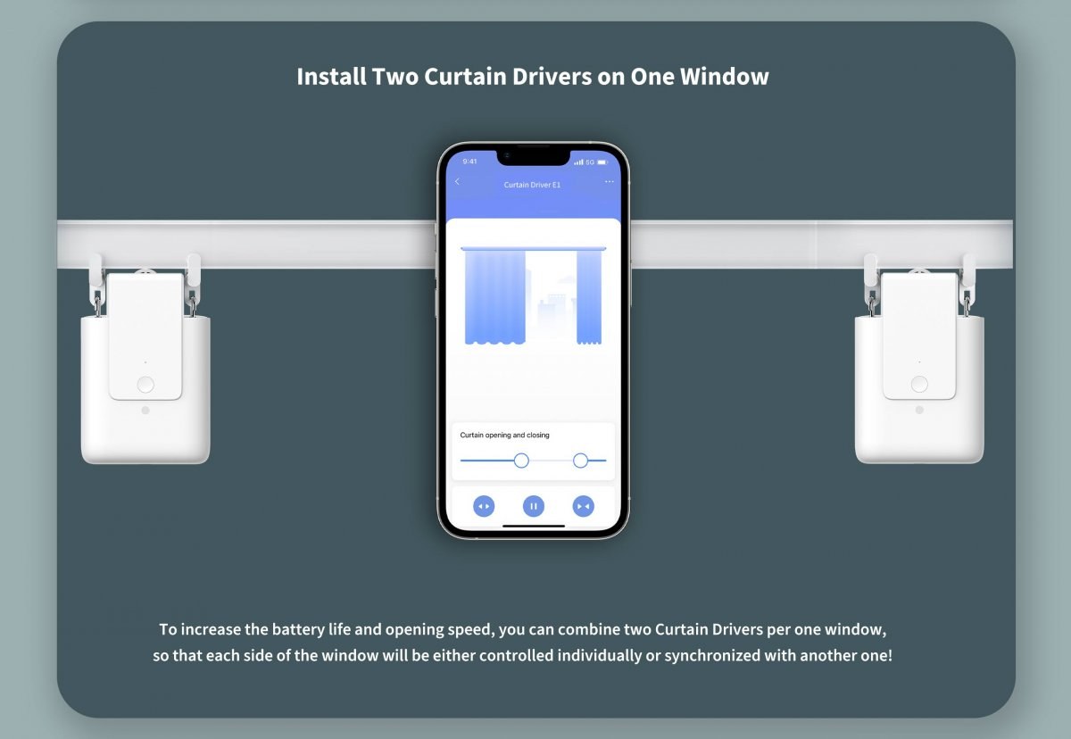 Podpora zoskupovania zariadení: Môžete si vybrať medzi jedným alebo dvoma ovládačmi závesov na okno. V prípade inštalácie dvoch sa budú dať zoskupiť tak, aby otvárali závesy súčasne!