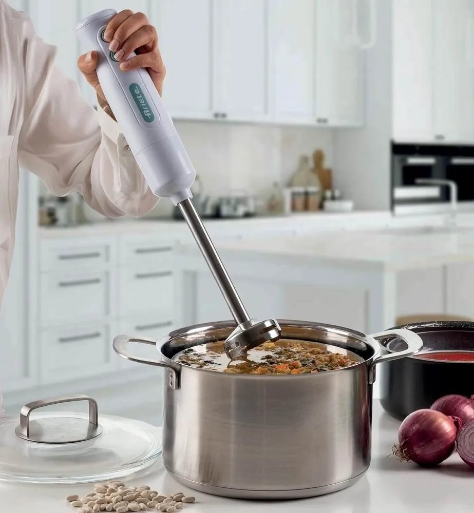 Ergonomická gumová rukoväť tohto ponorného mixéra zaisťuje komfortné a pevné držanie pri používaní. Jeho elegantný lesklý a matný povrch krásne dopĺňa každý kuchynský interiér.