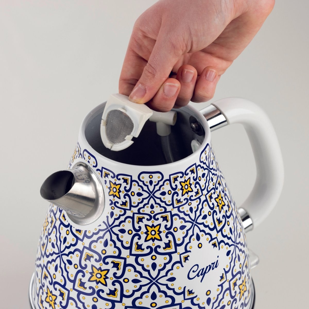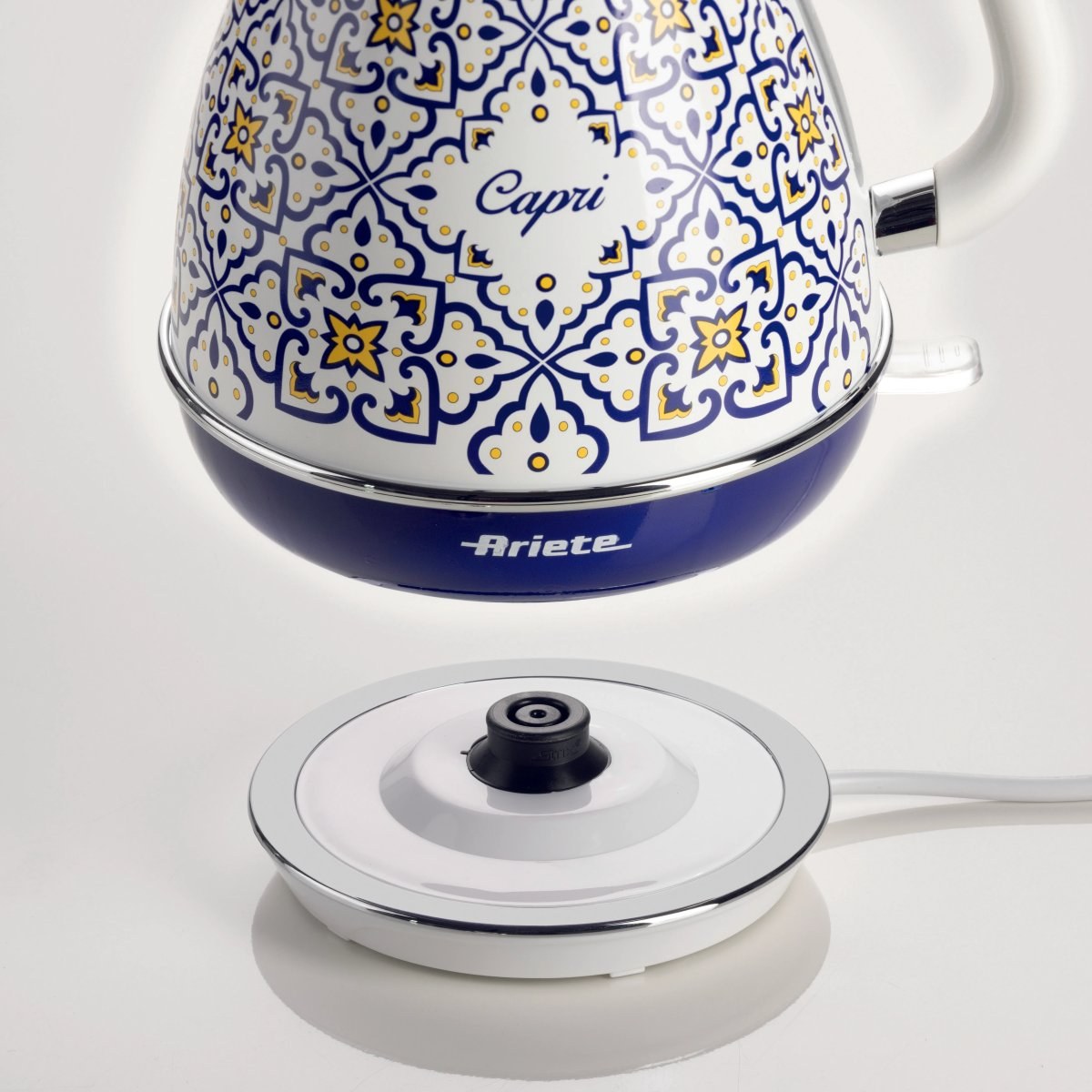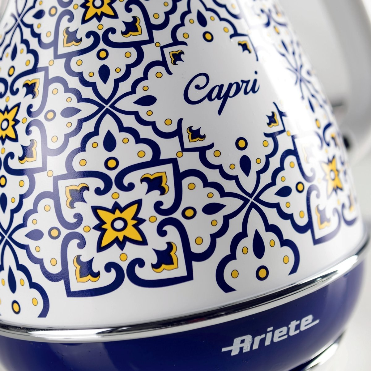 Rýchlovarná kanvica Ariete Capri v jasných farbách a elegantnom dizajne prináša pohodovú atmosféru juhotalianskeho ostrova. S príkonom 2000 W uvarí až 1,7 litra vody rýchlo a efektívne. Má otočnú základňu o 360 stupňov, rukoväť s mäkkým povrchom a vyberateľný odvápňovací filter pre jednoduchú údržbu a vždy čistú vodu.Dvojitý plášť