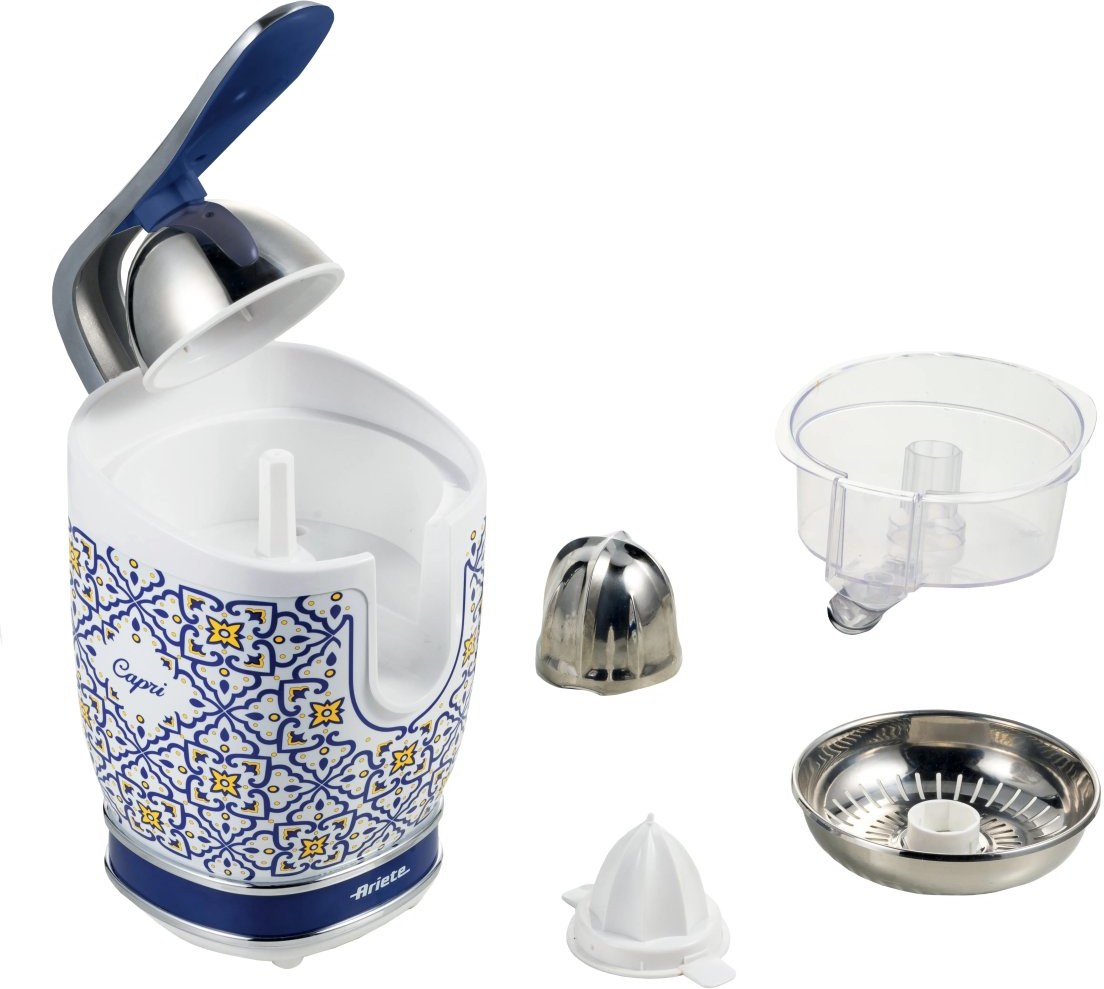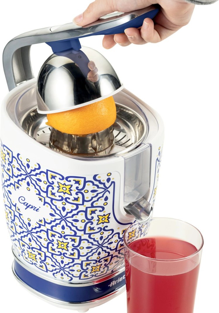 Citrusovač Ariete Capri, s dizajnom inšpirovaným talianskym ostrovom Capri, vám spríjemní prípravu čerstvého džúsu. Vďaka elektrickému pákovému systému stačí vložiť rozkrojené ovocie, stlačiť páku a lis automaticky odvedie všetku prácu. S výmennými nástavcami podľa veľkosti plodu si ľahko pripravíte šťavu z citrónov, pomarančov a ďalších citrusov. Každé raňajky tak získajú nádych sviežosti, chuti a vitamínov.Dva lisovacie kužele