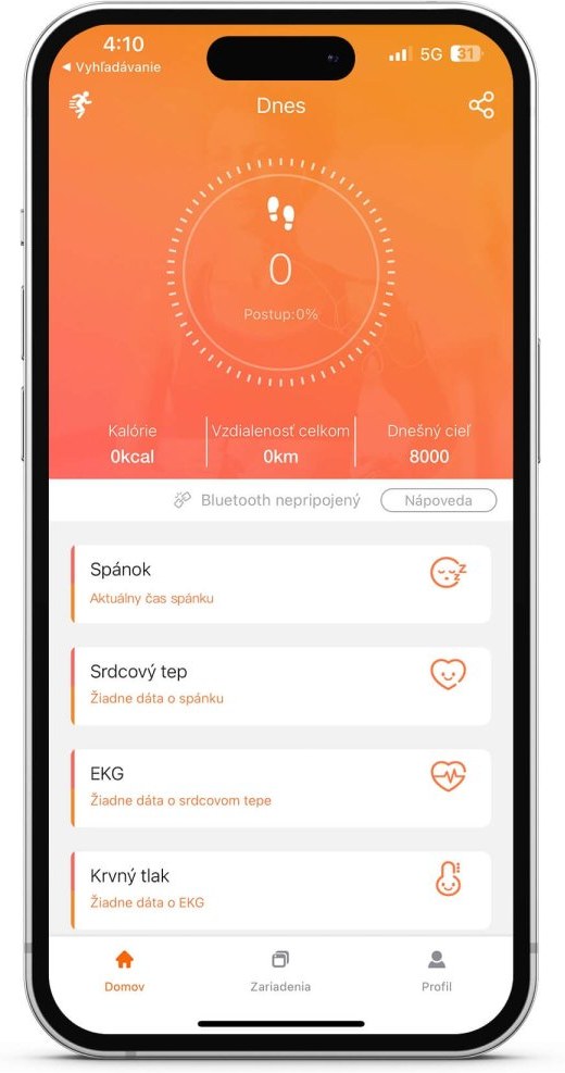 Športový režim chôdza, beh, cyklistika, švihadlo, bedminton, basketbal, futbal, beh na páse, joga, voľný pohyb / posilňovňa, eliptický trenažér...