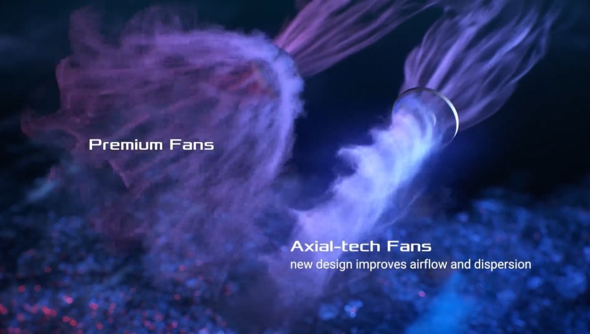 Dual GeForce RTX 3060 je vybavený dvoma výkonnými ventilátormi Axial-tech. Tieto ventilátory, novo navrhnuté pre najnovšiu generáciu špičkových grafických kariet majú menší náboj, ktorý umožňuje lopatkám a bariérovému krúžku zvýšiť tlak vzduchu smerom nadol.