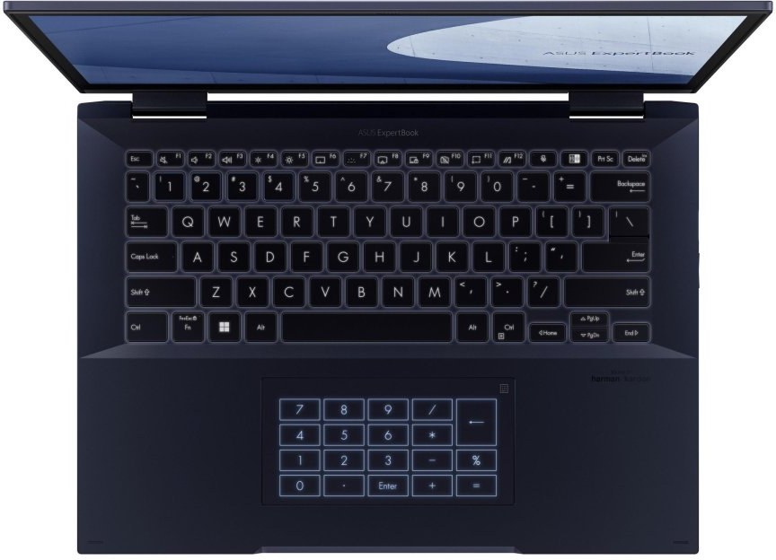 ExpertBook B3 Flip je vybavený LED podsvietenou numerickou klávesnicou integrovanou do touchpadu. Ak chcete funkciu zapnúť či vypnúť, kliknite vpravo hore na ikonu NumberPad. Opätovným dotykom na ikonu sa vrátite späť na normálny režim touchpadu. S nástrojom NumberPad môžete rýchlo zadávať dáta alebo počítať. Touchpad môžete použiť pre ovládanie kurzora aj v prípade, že je NumberPad aktivovaný a to vďaka inteligentnému softvéru.