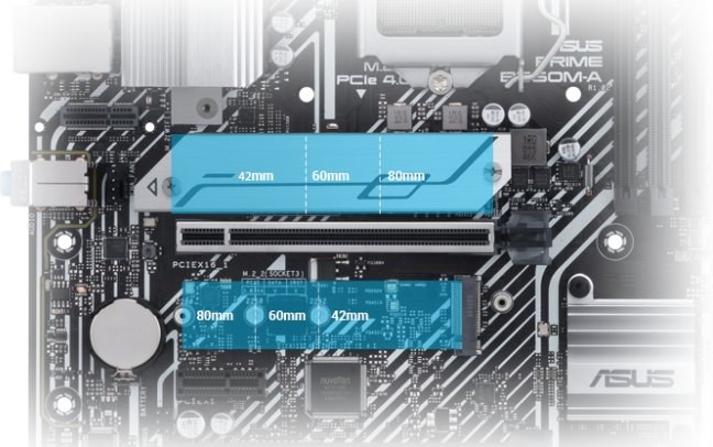 Doska poskytuje dva M.2 sloty, kde jeden podporuje PCIe 4.0 x4 moduly (až 2280), zatiaľ čo druhý umožňuje použitie PCIe 3.0 x4 aj SATA modulov (až 2280). Spoločne poskytujú najrýchlejšie a najflexibilnejšie dostupné M.2 rozhrania. Užívajte si vysoké prenosové rýchlosti v malom formáte, ktoré M.2 moduly prinášajú.