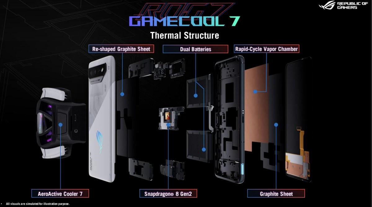 Vylepšený tepelný systém GameCool 7 v ROG Phone 7 je zatiaľ najlepší, chladí CPU zo všetkých smerov. Využíva trojrozmerný prístup. Po prvé, pri krátkych reláciách tepelná zlúčenina nitrid bóru (BN) na jednej strane CPU znižuje škrtenie. Po druhé, o stredne dlhé relácie sa stará väčšia parná komora a grafitové dosky na druhej strane CPU. Nakoniec, pri maratónskych reláciách sa AeroActive Cooler 7 – s ventilátorom umiestneným priamo nad modulom CPU – dostane do hry pre aktívne chladenie poháňané AI a obsahuje Peltierov prvok pre extra chladiaci výkon.Parná komora RAPID-CYCLE