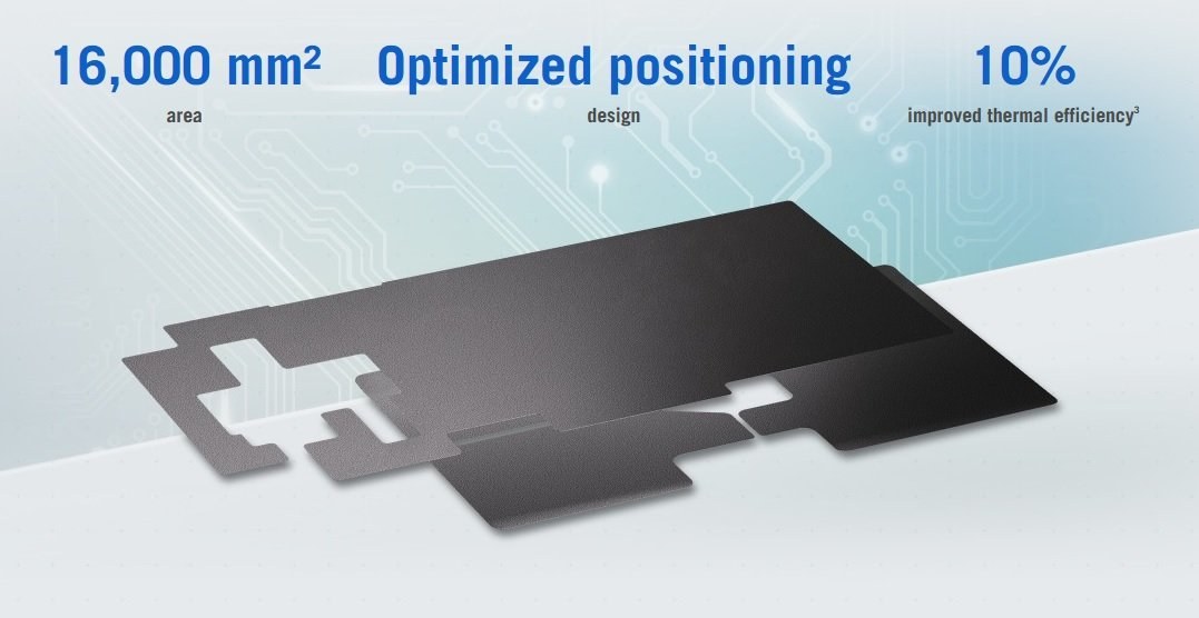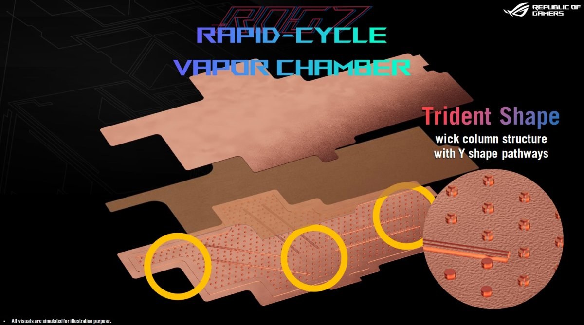 Nová parná komora ROG Rapid-Cycle má špeciálne navrhnuté potrubia, ktoré rýchlo odvádzajú kondenzovanú vodu späť do stredu komory, čím sa zvyšuje účinnosť chladenia. Šesť kanálov spätného toku kvapaliny funguje ako mini diaľnica pre kondenzovanú vodu a stĺpiky v tvare trojzubca na dlhých okrajoch komory zvyšujú účinnosť.Optimalizované grafitové plachty