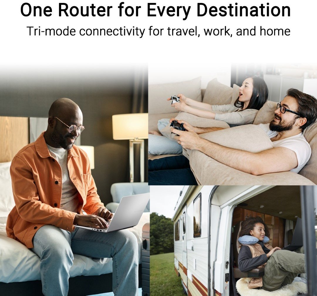 tri režimy pripojenia pre cestovanie, prácu a domáce použitie s mobilným tetheringom 4G/5G, súkromným hotspotom cez verejnú WiFi (režim WISP) a režimom routera.