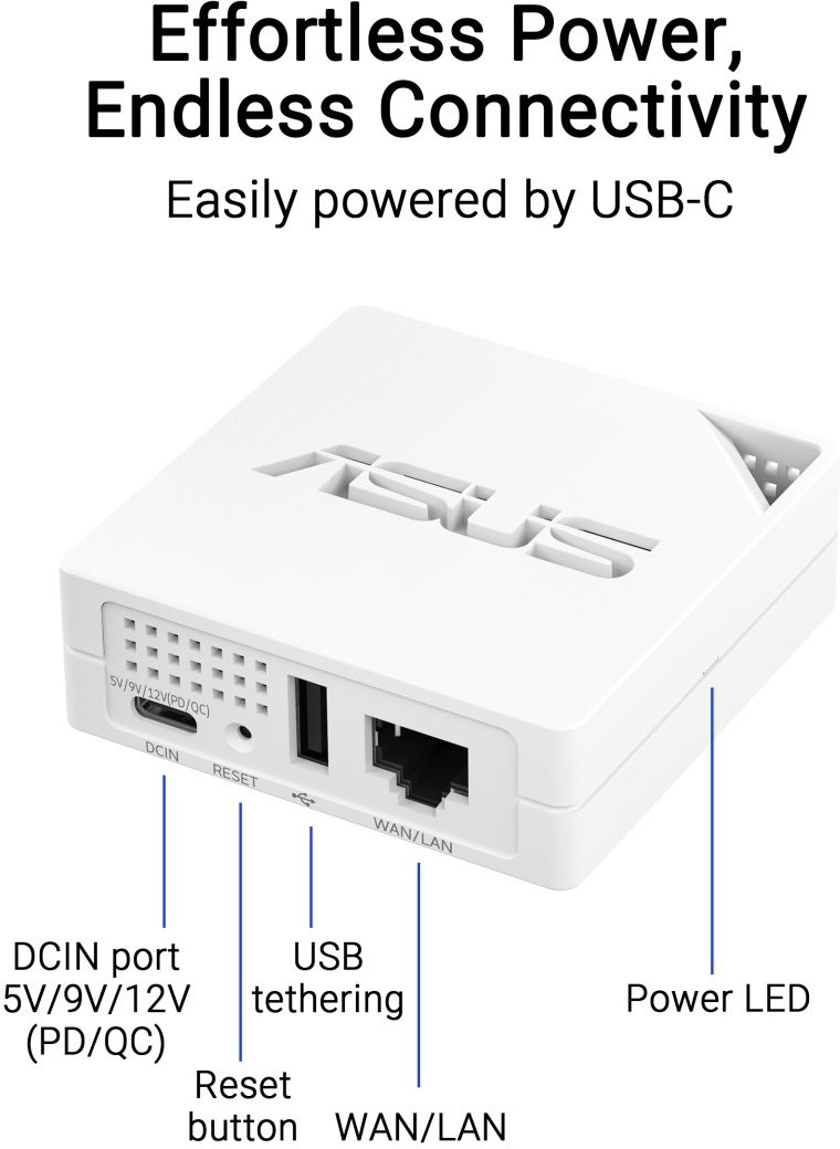 RT-AX50 Go je váš dokonalý spoločník, ktorý sa ľahko napája cez USB-C. Zabudnite na starosti s nosením viacerých adaptérov; stačí použiť prenosnú nabíjačku a zostať pripojení. Či už objavujete nové mestá alebo ste na služobnej ceste, vychutnajte si plynulý prístup k internetu s pohodlím napájania cez USB-C.