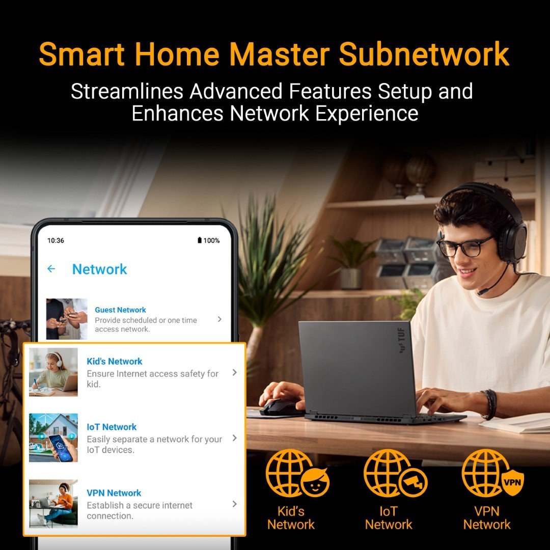 TUF Gaming BE9400 využíva výkon WiFi 7 a technológiu AiMesh novej generácie, aby poskytoval ultraširoké pokrytie, stabilnejšiu a bezpečnejšiu sieť a bohatú škálu funkcií – všetko pod jedným názvom siete pre celú vašu inteligentnú domácnosť.