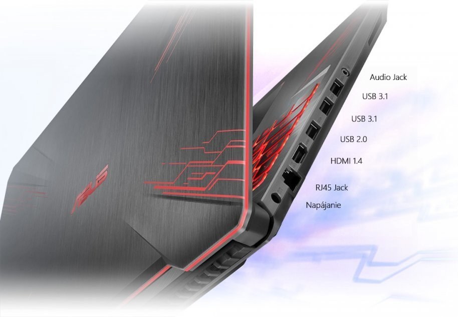 FX504 má všetky porty, ktoré potrebujete pre hry, produktivitu a zábavu. Jeden port USB 2.0 a dva porty USB 3.1 Gen 1 Typu A sú určené pre vaše herné periférie, zatiaľ čo HDMI 1.4 umožňuje pripojiť FX504 na externý displej. A pretože sú všetky umiestnené na ľavej strane notebooku, vaša myš sa bude držať ďalej od zamotaných káblov.