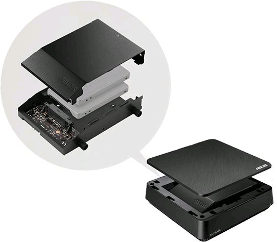 U počítače VivoPC VC62B lze jednotlivé komponenty snadno vyměnit. Praktický posuvný kryt umožňuje snadný a rychlý přístup k vnitřním součástem, abyste si mohli sami rozšířit paměť nebo vyměnit pevný disk.