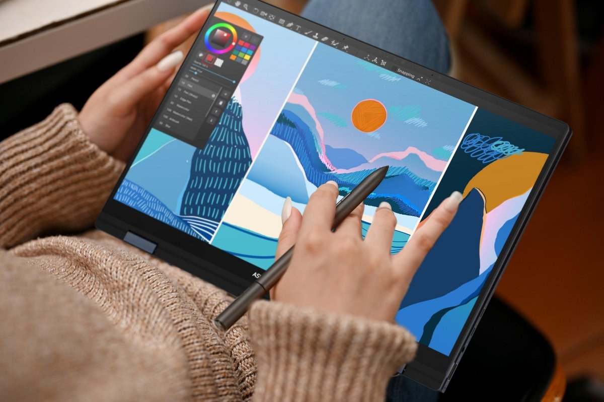 Konvertibilný notebook Zenbook Flip 14 OLED je ideálne zariadenie, s ktorým môžete pracovať aj relaxovať kedykoľvek a kdekoľvek. Vďaka odolnému pántu ErgoLift, ktorý je otočný o 360° ho môžete ľahko zmeniť do režimu notebook, tablet, stan alebo stojan. Zároveň je mimoriadne kompaktný a tenký len 15,9 mm.