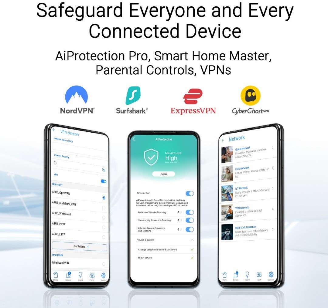 Robustný router chráni vašu inteligentnú domácu sieť pomocou komerčnej cloudovej ochrany od spoločnosti Trend Micro™, zatiaľ čo funkcie ovládania a správy umožňujú každému členovi vašej domácnosti bezpečne spravovať svoje pripojené zariadenia v neustále sa meniacom prostredí kybernetickej bezpečnosti. Navyše, pokročilé šifrované pripojenie chráni vaše online aktivity a údaje, čím zabezpečuje súkromie a bezpečnosť pripojení.