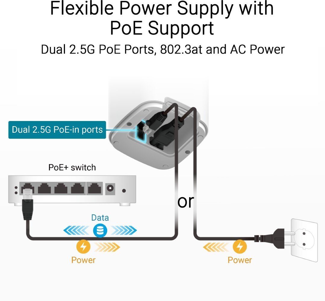 BD4 Outdoor podporuje ako PoE+ (Power over Ethernet, IEEE 802.3at), tak aj striedavé napájanie, čo umožňuje flexibilné a efektívne inštalačné možnosti vhodné pre mnoho prostredí. Je vybavený dvoma 2,5G PoE+ ethernetovými portmi s automatickou detekciou WAN, ktoré automaticky identifikujú typ vášho pripojenia, pričom určený WAN port podporuje funkciu PoE-IN. Táto flexibilita plug-and-play zaručuje optimálne pohodlie a výkon pre akúkoľvek vonkajšiu inštaláciu.