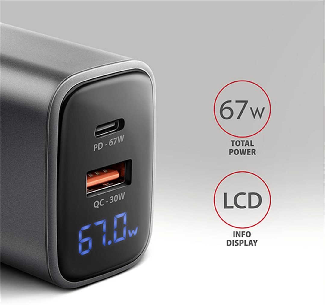 Cestovná nabíjačka do siete AXAGON ACU-PQ67D GaN umožňuje rýchle nabíjanie až dvoch mobilných zariadení súčasne. Vďaka celkovému výkonu 67W dokáže nabíjačka dobíjať notebooky, tablety, telefóny a ďalšie mobilné zariadenia najvyššou možnou rýchlosťou. Adaptér ponúka nielen štandardný USB-A konektor, ale aj obojstranný USB-C konektor. Prehľadný LCD displej zobrazuje aktuálny výkon nabíjania.