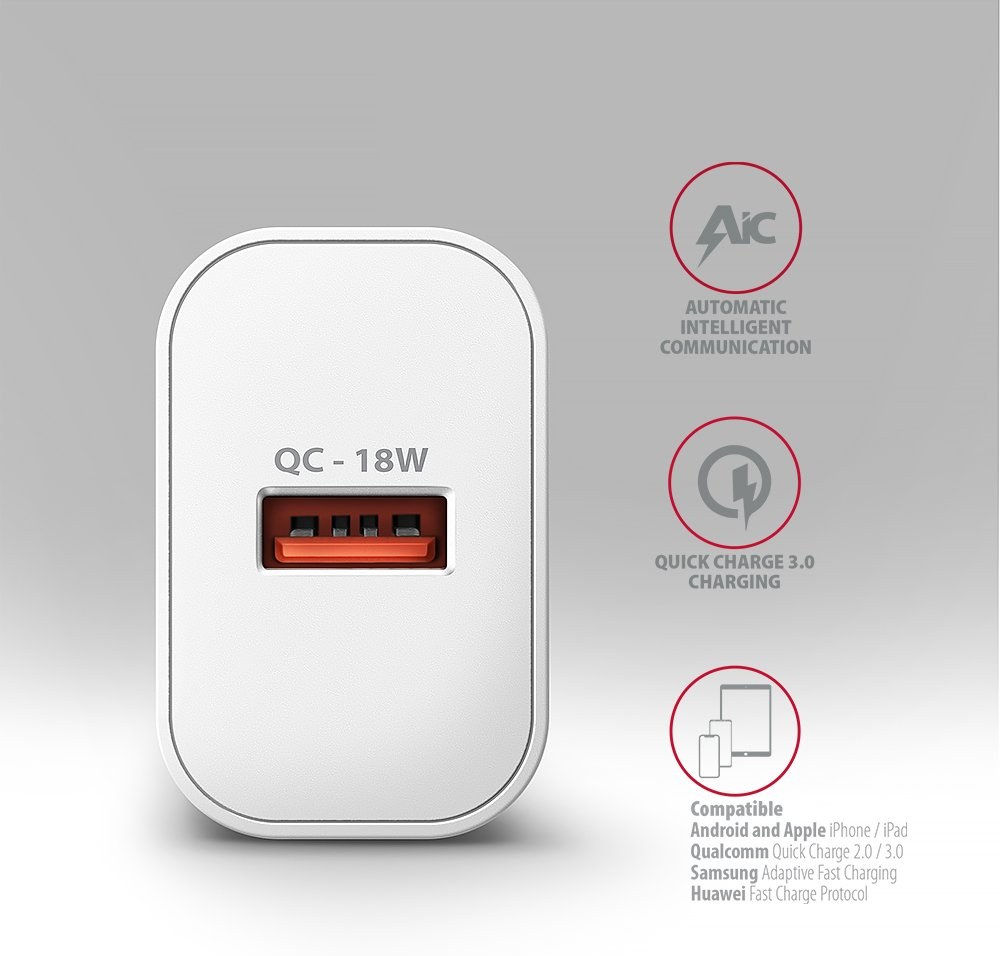 Nabíjačka je vybavená výstupom Quick Charge 3.0 USB typu A, čo umožňuje rýchle nabíjanie smartfónov a tabletov výkonom až 18W . Adaptér je tiež kompatibilný s ďalšími štandardmi rýchleho nabíjania telefónov, ako sú Apple iPhone, iPad, Samsung, Huawei, Honor, Xiaomi, Motorola a ďalších.