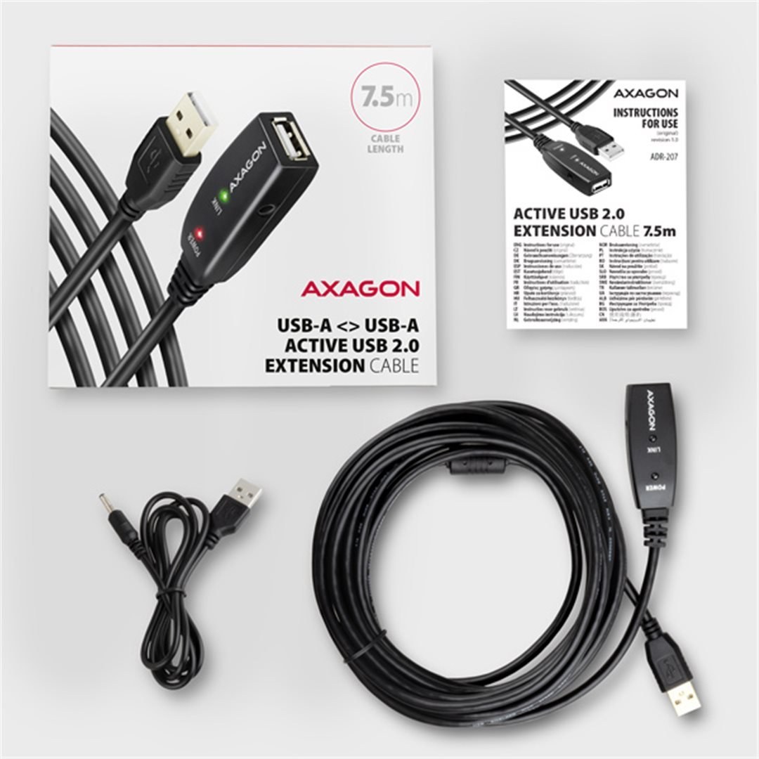 Aktívny predlžovací USB 2.0 kábel AXAGON ADR-207 s dĺžkou 7,5 metra je ideálny na prepojenie vášho počítača s USB zariadeniami, ako je myš, klávesnica, webkamera, tlačiareň, skener, ploter a ďalšími. Aktívny USB repeater kábel zosilňuje prenášaný signál a umožňuje pripojiť USB zariadenie na výrazne väčšiu vzdialenosť, než umožňuje pasívny kábel. Dosah kábla je možné ďalej predĺžiť použitím viacerých káblov za sebou.Veľkou výhodou kábla ADR-207 je integrovaný konektor prídavného napájania. Vo väčšine prípadov postačuje napájanie cez USB zbernicu, avšak pri zariadeniach s vyššou spotrebou môže byť napájanie cez USB pri väčších vzdialenostiach nedostatočné a prídavné napájanie zo siete môže v takýchto prípadoch problém vyriešiť.