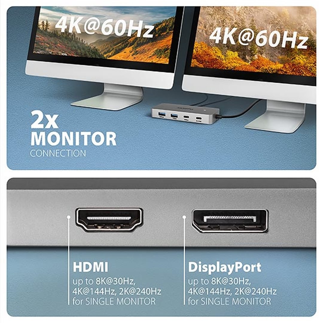 pripojenie cez USB-C, HDMI, DisplayPort, USB-C, USB-A, gigabit ethernet, pripojenie max. dvoch monitorov , 8K, aktívne napájanie, power delivery 100W, materiál kovZobraziť viac